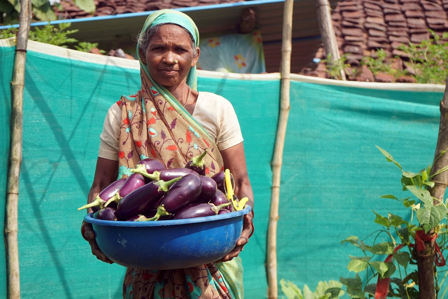 Soghi Devi harvests brinjals from her homestead farm in Chimkatola, Madhya Pradesh (Image: Tanmoy Bhaduri / IWMI)