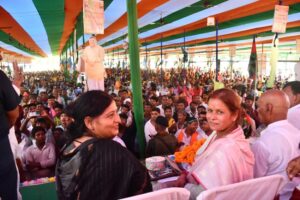 Ranju Geeta of the Janata Dal (United) addresses a gathering in her constituency Bajpatti, which falls in the flood-prone Sitamarhi district, which was hit by a drought this year (Image courtesy of the Office of Ranju Geeta)