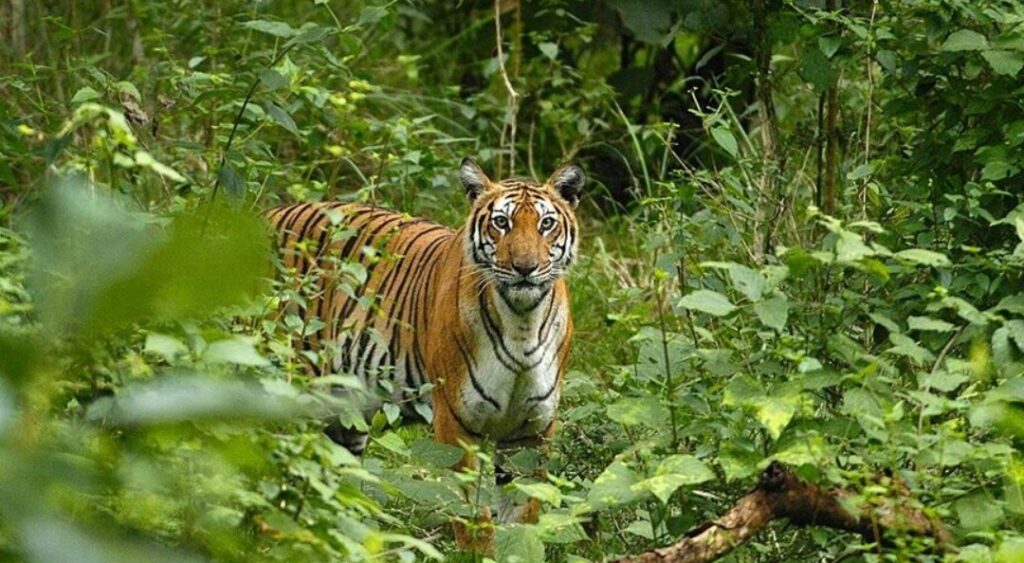 A tiger in the Western Ghats. A Wildlife Institute of India study recorded five large to medium-sized carnivores, including tigers, along the track corridor in the area (Image by Kalyan Varma via Wikimedia Commons)