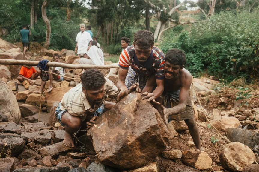 The film opens with a voice-over that introduces the village’s ecosystem and natural resources, revealing the community’s struggle for access to water. What follows is a patient observation of the tribal villagers as they meticulously restore an old well that had been buried over the years by floodwaters and debris from fallen rocks.