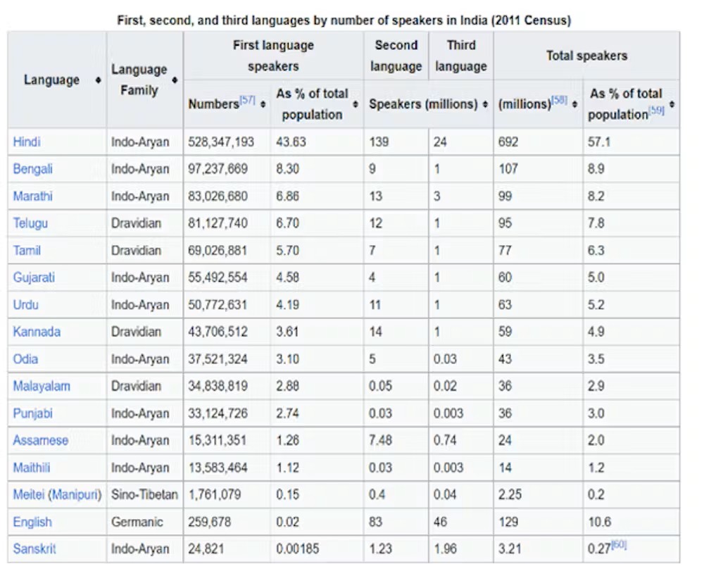 That means Hindi has a broad presence across regions, but it exists alongside many other languages with equal value, including Marathi, Bengali (97 million), Telugu (81 million), Tamil (69 million) and Meitei (1.8 million).