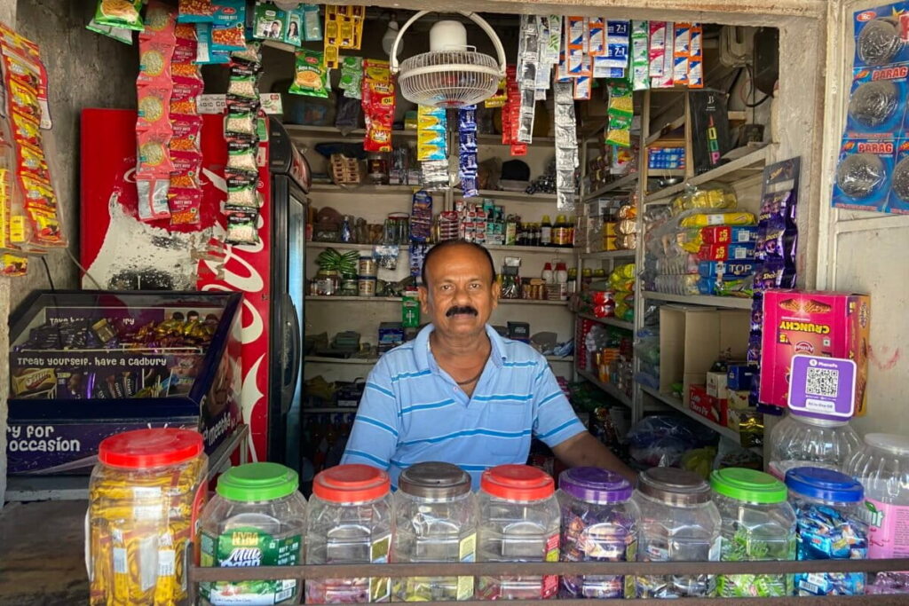 Betel shop owner Nrupati Jena in his shop near the gate of the thermal plant in Talcher, Odisha, that closed in 2021. Prior to its closing, Jena would earn ₹4,000 per day from plant workers. Today, his income has been cut by half, while other shops nearby have shut down completely (Image by Roli Srivastava)