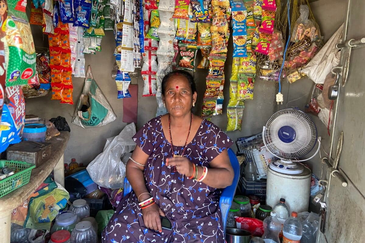 Among those who have set up shop here is Draupadi Raut. Her matchbox-sized store is stacked with bags of crisps, cookies, and dozens of small tobacco pouches in a polythene bag. The 47-year-old worked at the old plant for over two decades, earning a monthly income of 12,000 rupees, which she said was steady, unlike her income now.