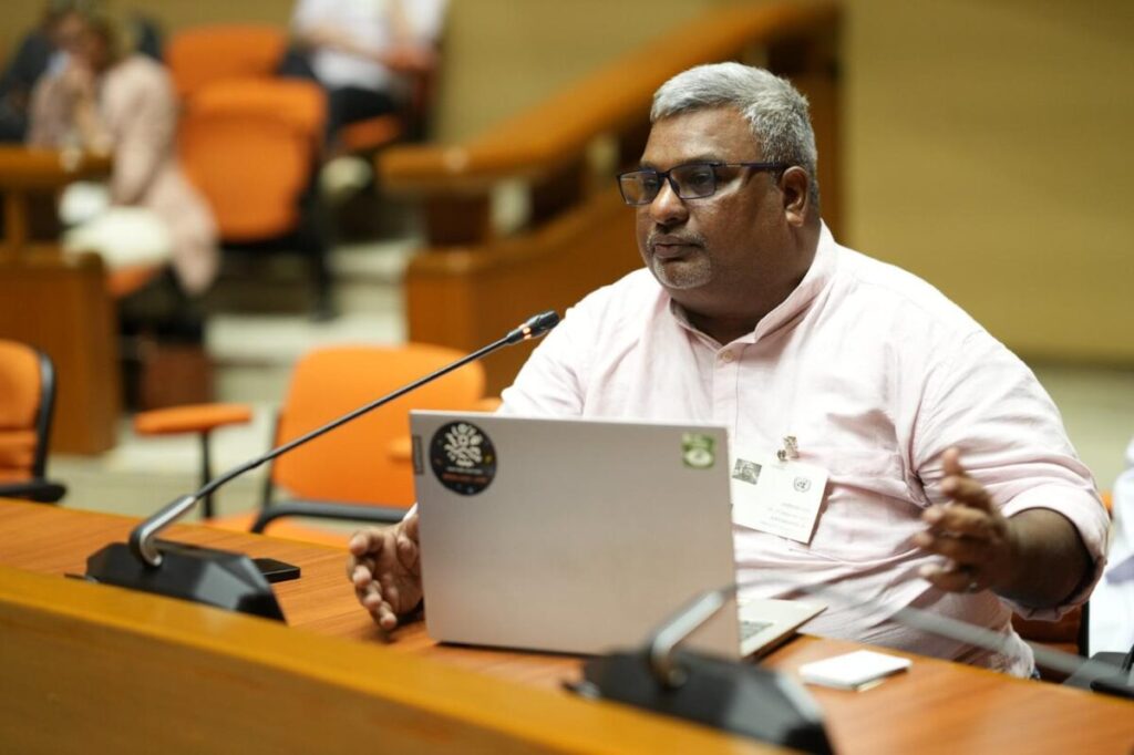 V.B. Ajayakumar at UN High-Level Political Forum 2024, New York. Ajay led delegations of frontline communities at international forums, calling for climate reparations, loss and damage finance, and recognition of traditional knowledge systems (Image courtesy: RIGHTS)